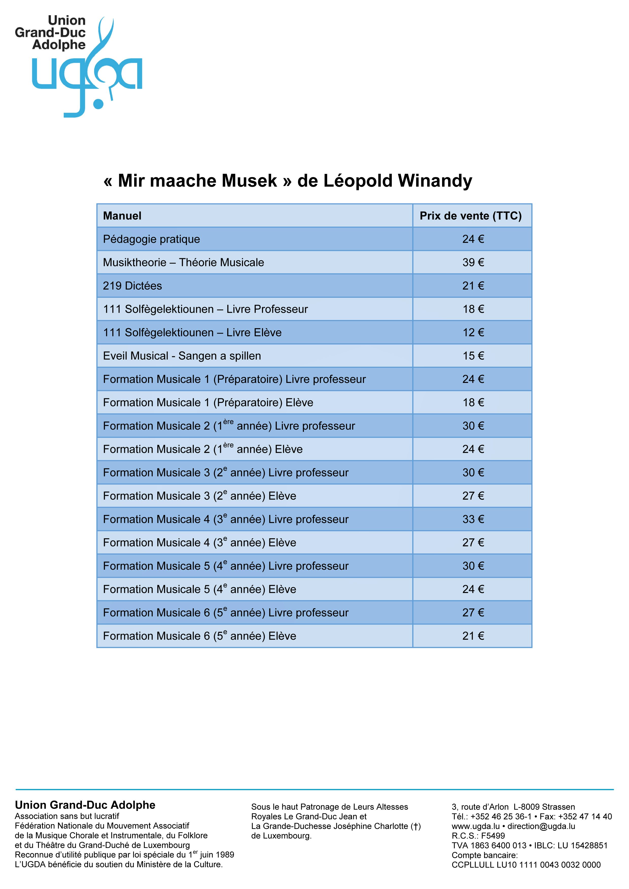 Pour les élèves et les enseignants de l’Ecole de Musique de l’UGDA, le Centre de documentation vend les manuels «Mir maache Musek» de Léopold Winandy (éveil et formation musicale).